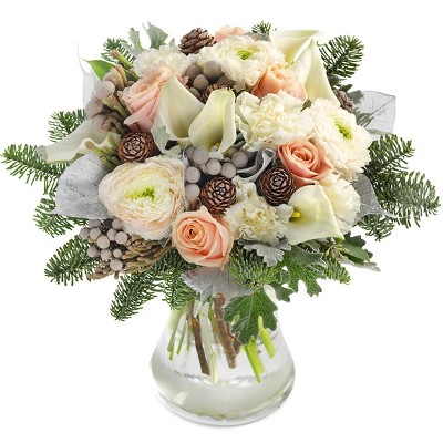 Sød vinterbuket med en elegant blanding af blomster som roser, ranunkler og nelliker. Med sine lyserøde farver og sølveukalyptus er denne buket et oplagt valg. Perfekt til fødselsdage, jubilæer og andre særlige lejligheder. Buketten er et eksklusivt floristhåndværk, og blomsterne er nøje udvalgt for at sikre høj kvalitet. Hver buket er unik og bindes ud fra sortiment og sæson, men bevarer altid sin farve og form. Buketten leveres af en lokal florist.